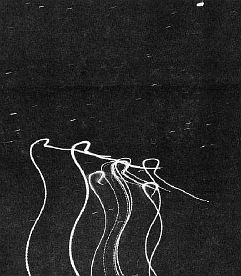 За этими примерами непосредственно возникших кривых следуют такие, которые появились в результате отражения на пленке. Когда световые точки на темном фене фотографируются с помощью ручной камеры, в некоторых случаях возникают далеко идущие световые кривые, хотя в положении камеры были только незначительные колебания. В ходе этого процесса, который я бы назвал "точечный свет" или "пунктирный свет-катадиоптрия", отражаемая пленкой световая точка сильно отклоняется обратными сторонами линз, вновь падает на пленку, так что на ней возникает увеличенное изображение кривой колебательного движения.