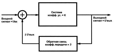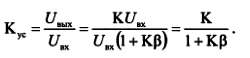 Если разорвать петлю обратной связи, то сигнал на выходе Uвых был бы равен К·Uвх (разумеется, в реальной системе напряжение питания его бы ограничило, но для наших рассуждений это неважно). Однако при действии обратной связи это не так. На вход выходной сигнал передается с коэффициентом ослабления β, и сигнал после сумматора, т. е. на входе основной системы, будет равен Uвх — β·Uвых (минус, т. к. обратная связь отрицательная). Этот сигнал передается на выход с коэффициентом К, т. е. Uвых = К·(Uвх — β·Uвых), или Uвых = К·Uвх/(1 + К·β). Поскольку коэффициент передачи Кус всей системы по определению есть Uвых/Uвx, то в результате для него получаем следующую формулу: