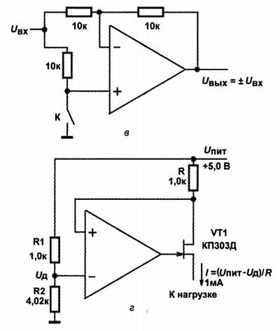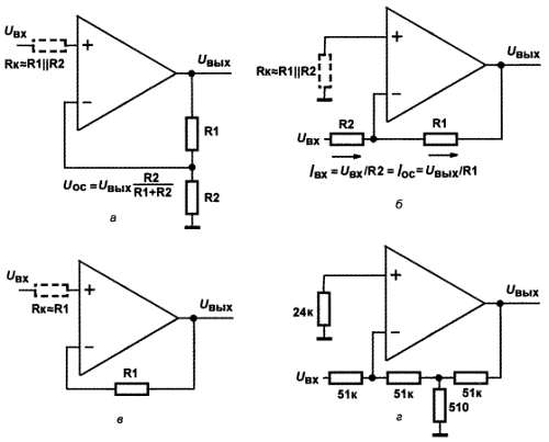 а — неинвертирующий усилитель; б — инвертирующий усилитель, в — повторитель; г — инвертирующий усилитель с высоким коэффициентом усиления
