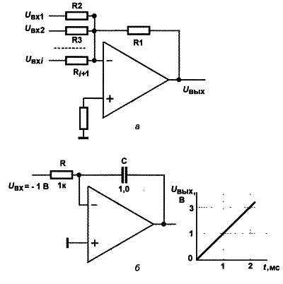 Второй необходимой составляющей таких машин был интегратор на ОУ, схема которого приведена на рис. 12.5, б. Этот интегратор, в отличие от интегрирующей RC-цепочки из главы 5, действительно осуществляет операцию интегрирования в корректной форме. Например, если подать на его вход постоянное напряжение (отрицательное), то напряжение на выходе будет линейно возрастать со скоростью Uвх/RC вольт в секунду (интеграл от константы есть прямая линия). Входной сигнал можно подать и на неинвертирующий вход, заземлив резистор R — получим неинвертирующий интегратор. Можно также объединить интегратор с сумматором — тогда интегрирование будет осуществляться по сумме входных напряжений с соответствующими весовыми коэффициентами. Интеграторы, как и сумматоры, используются и по сей день в различных схемах.