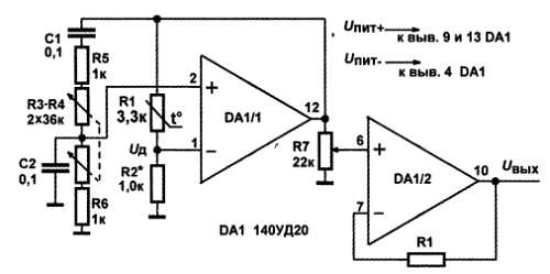 Здесь можно использовать термистор любого типа (например, классический ММТ-1 или подробно описанный в главе 13 В57164-К) с номинальным (при 20 °C) сопротивлением от нескольких килоом до нескольких десятков килоом. При этом сопротивление резистора R1 должно быть примерно равно номинальному сопротивлению термистора при 20 °C или несколько меньше этого значения (чем оно меньше, тем хуже для термистора, т. к. он может перегреваться питающим током, однако, чем оно больше, тем меньше рабочий диапазон напряжений).