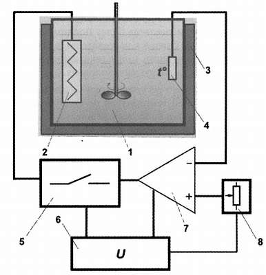 1 — объект регулирования; 2 — нагреватель, 3 — теплоизоляция, 4 — датчик температуры; 5 — исполнительное устройство, 6 — источник питания; 7 — усилитель; 8 — задающее устройство