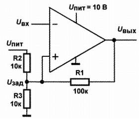 Простые конструкции термостатов, как мы говорили, используют релейный принцип регулирования — «включено-выключено». Иначе такие регуляторы еще называют позиционными. ОУ здесь удобно включать по схеме компаратора (от англ. compare — сравнивать) — т. е. без собственной обратной связи. Поскольку коэффициент усиления его в таком включении огромен, то он и будет находиться в одном из двух состояний: если сигнал с задающего устройства больше сигнала датчика, на выходе ОУ будем иметь практически положительное напряжение питания, если меньше — отрицательное (или ноль, если питание однополярное).