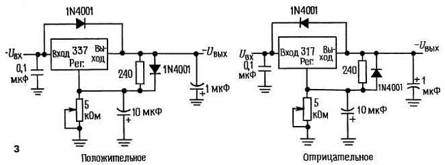 Рис. 6.65. з — трехвыводные стабилизаторы с повышенным подавлением пульсаций (диоды защищают от коротких замыканий входа и выхода);