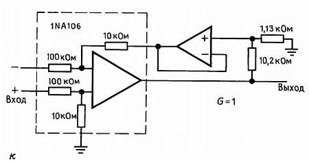 Рис. 6.65. к — дифференциальный повторитель с диапазоном синфазного сигнала +100 В;