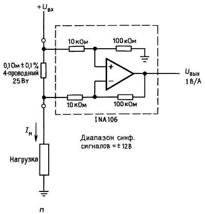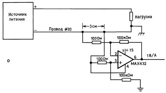 Рис. 6.65. о — усилитель токового шунта: ОУ типа модулятор-демодулятор использует в качестве резистора съема тока возвратный провод питания калибра 20 длиной 1,2 дюйма; напряжение питания ОУ — от +5 до +15 В;