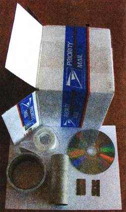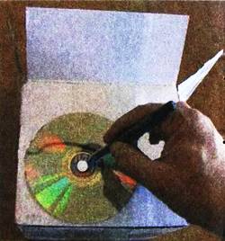 Установите компакт-диск в верхней части окна, прорезанного в коробке, отступив примерно сантиметр от левого края, и поблизости к нижнему окну, как показано на фото (рис. 2).