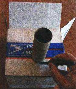 Отметьте с помощью фломастера или карандаша положение центрального отверстия диска. Эта отметка покажет вам, где в дальнейшем будет проходить бумажная трубка. Теперь разместите ее на коробке таким образом, чтобы нижний ее конец оказался над отметкой, которую вы только что нарисовали. Нарисуйте еще один круг на поле, обозначив окружность бумажной трубки (рис. 3).