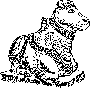 Об этом бычке следует сказать особо, так как он символ плодотворящей мощи великого бога В шиваитских храмах головой ко входу, или к «гарбагрихе» — святилищу, куда помещают изображение бога, — лежит изваянный из камня Нанди, и скульпторы не забывают показать, что это не холощеный бычок. Напомню читателю, что в знак благодарности за какое-нибудь радостное событие — чаще всего за рождение сына, которого очень ждали, — Шиве дарят бычка, т. е. на ляжке животного ставят клеймо бога Шивы — изображение трезубца — и отпускают его на волю. Все, кто встречает такого бычка, стараются его накормить и напоить, так как это считается заслугой перед Шивой, и ни один индус во всей Индии не решится причинить ему какой-нибудь вред или, что является самым страшным грехом, подвергнуть его холощению и в качестве вола использовать на работе.