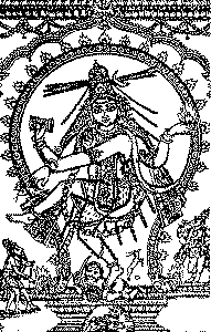 В этом своем качестве он изображается в позе танцующего человека. Одной ногой Шива попирает карлика, символизирующего скованность души неведением, другая его нога согнута в Колене и поднята. В двух из своих четырех рук он держит барабанчик — ритм созидания — и огонь — силу разрушения, опущенные пальцы третьей руки указывают на поверженного карлика, как бы подчеркивая, что путь спасения лежит в избавлении от неведения, а четвертая рука с пальцами, поднятыми вверх, являет собой знак защиты и покровительства. Танцует Шива в кольце из язычков пламени, что свидетельствует о его власти над космической энергией. Такова сложнейшая символика, воплощенная в образе Шивы-Натараджи с глубокой древности Все его основные свойства совершенно очевидно связаны с исконными доарийскими культами Индии. С ними же, по всей видимости, связан и институт служения богу танцем, а также претворением в жизнь сочетаний мужского и женского начал.