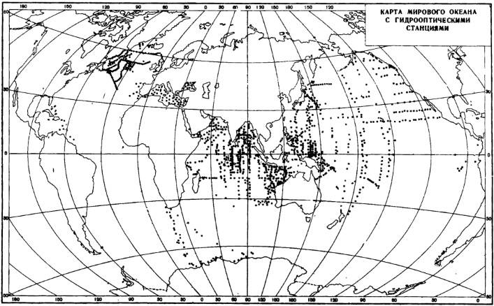 Большой вклад в изучение оптических свойств Мирового океана внесли советские исследователи. «Витязь» в Тихом и Индийском океанах, «Михаил Ломоносов» в Атлантическом океане, «Обь» в приантарктических водах, «Академик С. Вавилов» в Средиземном и Красном морях покрыли довольно густой сетью гидрооптических станций обширнейшие акватории. На рис. 1 представлена карта Мирового океана с гидрооптическими станциями (из них почти 75 % принадлежит советским экспедициям).
