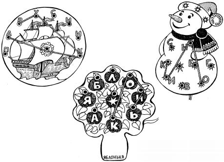 Игра состоит из деревянного макета яблони (снеговика, ромашки, парусника). На макете большими буквами написано слово. Например, ЯБЛОНЬКА. Около каждой буквы есть металлическая кнопка с дырочкой. В серединке звездочка с такой же кнопочкой. Звездочка будет заменять любую букву алфавита. К игре прилагается шнурок.