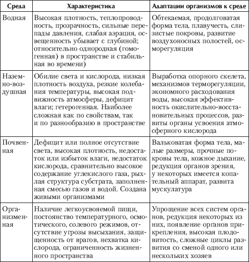 Сравнительная характеристика сред жизни и адаптации к ним живых организмов