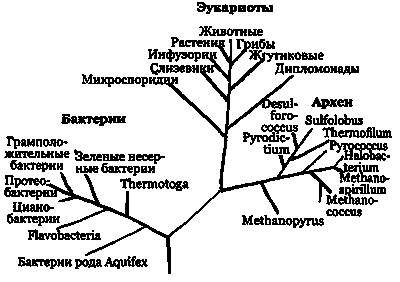 Рис. 28.10. Филогенетическое дерево, основанное на последовательности 16S РНК разных организмов и предполагаемом универсальном общем предке в качестве «ствола».