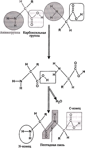Рис. 28.9. Процесс трансляции, связывающий друг с другом две аминокислоты пептидной связью с выделением воды. Карбоксильные и аминные группы заключены в рамки, а переменные боковые цепочки обозначены буквой R.