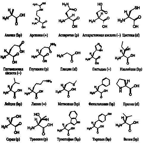 Рис. 28.7. Структура 20 аминокислот, используемых в синтезе биологических белков. Указан электрический заряд каждой аминокислоты: (+) для положительно заряженных, (-) для отрицательно заряженных, (p) полярные незаряженные, (hp) гидрофобные, (sf) особые формы.