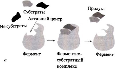 Рис. 28.3. Ферментативный катализ, (а) Фермент-катализатор захватывает реагирующие молекулы (субстраты) и держит их вместе в оптимальном положении, поэтому они могут легко прореагировать и создать продукт. (б) Влияние ферментативного катализа на скорость биохимических реакций в зависимости от времени.