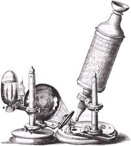 Рис. 28.1. Микроскоп Роберта Гука; рисунок из его книги «Микрография». Он автор термина «клетка».