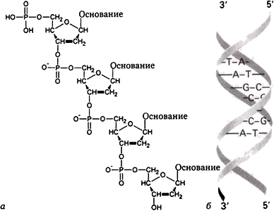 Рис. 28.5. Объединение нуклеотидов в нить ДНК (а) и то, как эти нити соединяются в двойную спираль посредством взаимодействия комплементарных оснований (б).