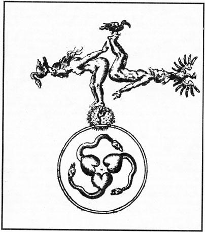 Это сопровождение, данное Василием Валентином к девятому ключу, пожалуй, самое загадочное из всех; именно на этой стадии Великого Делания происходят самые удивительные превращения первовещества, переливающегося всеми цветами радуги. Мужчина и женщина здесь также изображают серу и ртуть. Три сердца со змеями – три их начала. Ворон – символ черного, лебедь – белого, павлин – радужного, а феникс – красного цвета.