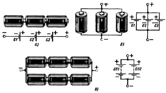 Когда требуется одновременно увеличить и напряжение, и ток, прибегают к смешанному соединению элементов в батарею: элементы сначала соединяют последовательно в группы до требуемого напряжения, а затем эти группы соединяют параллельно (рис. 162, в).