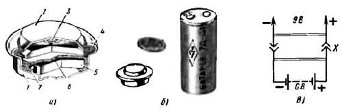 Рис. 163. Устройство малогабаритного кадмиево-никелевого аккумулятора (а), внешний вид аккумулятора и аккумуляторной батареи 7Д-0,1 (б) и схема подключения батареи к потребителю тока (в)
