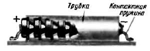 Аккумуляторную батарею, подобную батареи 7Д-0,1, можно составить из нескольких аккумуляторов Д-0,06, Д-0,1 или Д-0,25, соединив их последовательно. Напряжение батареи будет равно сумме напряжений всех входящих в нее аккумуляторов. Компактная батарея получится из аккумуляторов, если ее аккумуляторы поместить в пластмассовую или картонную трубку подходящего диаметра, как показано на рис. 164. Пружинные контакты такой батареи прижмут аккумуляторы друг к другу и одновременно будут служить ее полюсными выводами.