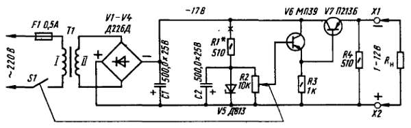 Резистор R2 на мощность рассеяния менее 0,5 Вт должен быть группы А, т. с. его сопротивление между выводом движка и любым из крайних выводов прямо пропорционально углу поворота оси. Это необходимо для того, чтобы его шкала выходных напряжений была возможно более равномерной. Коэффициент h21Э транзисторов может быть небольшим, например 15–20, важно лишь, чтобы они были исправными. Причем вместо транзистора МП39 можно использовать любые другие маломощные низкочастотные транзисторы (МП40-МП42), а вместо П213Б — транзисторы П214-П217, П201, П4 с любым буквенным индексом. Мощный транзистор V7 желательно установить на радиаторе. Резисторы R1, R3 — типа МЛТ на любую мощность рассеяния. Электролитические конденсаторы — типа К50-6. Их емкости могут быть больше 500 мкФ, что еще лучше сгладит пульсации выпрямленного тока. Что же касается их номинальных напряжений, то для конденсатора С1 оно должно быть не менее 25 В, а для С2 — не менее 15 В. Стабилитрон V5 серии Д813 или подобные ему Д811, Д814Г с напряжением стабилизации 12 В. Для самого выпрямителя кроме диодов серии Д226 можно использовать диоды Д7 с любым буквенным индексом.