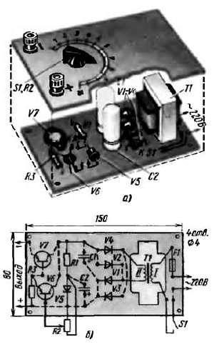 Рис. 170. Конструкция блока питания и схема соединения деталей на монтажной плате