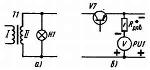 Ко вторичной обмотке трансформатора можно подключить коммутаторную лампочку накаливания Н1 (на рис. 171, а), рассчитанную на напряжение 12 В, и укрепить ее на верхней лицевой панели. Она, загораясь, будет служить индикатором подключения блока к сети.