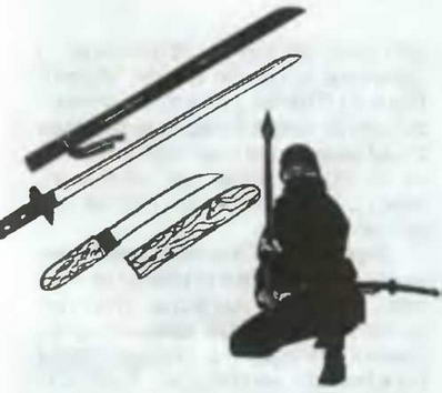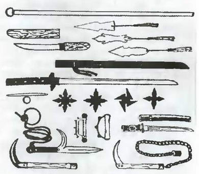 В этих убийцах ценились смекалка и хитрость. Под их руками любой предмет мог стать оружием. Кусаригама напоминала собой заостренный серп, к которому на цепи был привязан груз: эту связку ниндзя кидал во врага. На пальцы ниндзя надевал железные когти и ими наносил раны в единоборстве. Во рту прятал фукибари — трубочку, из которой, сблизившись с врагом, стрелял иголками. При себе держал бамбуковую трубку с насыпанным в нее порохом и швырял ее в лицо противника. В случае преследования бросал под ноги врагам тэцубиси — звездочку с торчавшим из нее ядовитым шипом. У женшин-ниндзя был популярен какутэ — кастет, чьи выступающие части смазывались ядом.