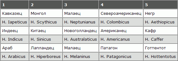 И так род человеческий составляет одно великое целое, и состоит только из одного вида «Homo sapiens», но раздробленного, подобно белому солнечному лучу, на несколько цветных разностей, подавших повод разделить людей на столько отдельных групп, сколько находится главных различий в цвете кожи. Эти группы названы племенами (races). Линней, приняв за основание эту различную цветность кожи, разделил род человеческий на пять племен: 1 на Американское — бурое; 2 на Европейское — белое; 3 Азиатское — желтое; 4 Африканское — черное; и 5 безобразное или уродливое (monstrosa).