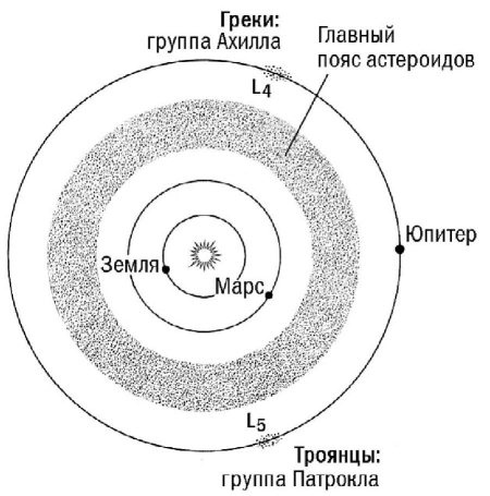 Оказалось, что астероиды живут в полном согласии с абстрактной математикой. Греки и троянцы совершают устойчивое либрационное движение (покачивание) вблизи точек Лагранжа L4 и L5, отстоящих на равное расстояние от Юпитера и Солнца. Часто для краткости оба семейства вместе называют троянцами. Первый из них – астероид 588 Ахилл открыл Макс Вольф в 1906 г. К 2000 г. было обнаружено 257 троянцев, к маю 2003 г. их было уже 1600, а в феврале 2010 г. было открыто 4076. Из них 2603 движутся в окрестности точки L4 и 1473 – в окрестности точки L5. По оценкам, общее число троянцев на орбите Юпитера может превысить 1 млн. Хуже обстоят дела с открытием подобных семейств у других планет. Несколько небольших астероидов было замечено вблизи лагранжевых точек Сатурна (подтверждения пока нет), 7 найдено у Нептуна, да еще 4 «троянца» обнаружены в лагранжевых точках Марса.