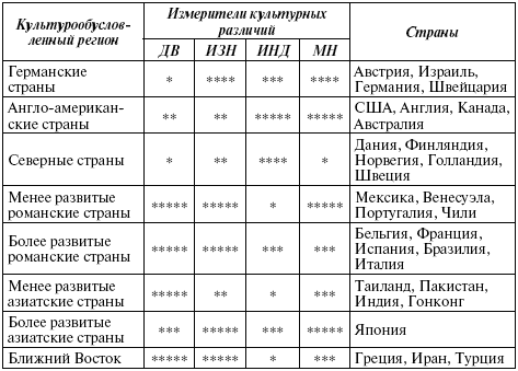 Распределение обследованных стран по четырем показателям культурных различий: индивидуализм (ИНД), избегание неопределенности (ИЗН), дистанции власти (ДВ), маскулинитет (МН) приведены в табл. 2.7.[36]