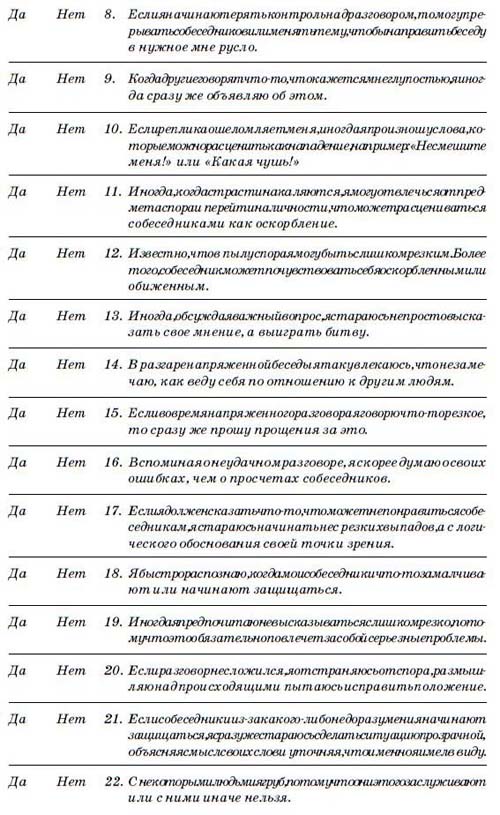 Тест для оценки поведения в стрессовой ситуации Насколько хорошо вы себя контролируете? Один из действенных способов развить в себе эту способность — понаблюдать за своим поведением в стрессовой ситуации. Что вы делаете, когда разговор становится напряженным? Чтобы выяснить это, ответьте на вопросы, приведенные ниже. Это поможет вам увидеть, к какой тактике вы обычно прибегаете, если внезапно оказываетесь в центре критической дискуссии. С помощью этого теста вы также сможете понять, какие главы данной книги будут для вас особенно полезными.