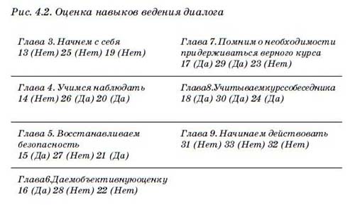 Итог теста относительно форм молчания и агрессии подскажет, как часто вы используете эти далекие от совершенства стратегии. Нередки случаи, когда испытуемые набирают много очков по обоим показателям. Высокий результат (одна или две галочки в ячейке) означает, что вы прибегаете к этой технике довольно часто. Кроме того, это показывает, что ничто человеческое вам не чуждо. Большинство из нас склонны как отмалчиваться, так и навязывать свое мнение, в зависимости от обстоятельств. Семь ячеек таблицы на рис. 4.2 отражают наличие у вас навыков, рассмотренных в соответствующих главах данной книги. Если вы показываете высокие результаты в одной из них (две или три галочки в ячейке), это значит, что вы уже умело владеете этим навыком. Если результаты низкие (ноль или одна галочка), возможно, вам следует уделить особое внимание именно этим главам.