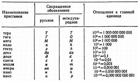 Недавно в Москве открылся молочный магазин, где все товары продаются только автоматами. Есть в этом магазине и кассир-автомат для размена денег. Если вы опустите в кассу 20 копеек, он выдаст вам, например, два гривенника, опустите полтинник — получите 10 пятачков. Подобным разменом часто приходится заниматься при решении задач, связанных с электрическими цепями. В этом случае разменивают единицы измерения — амперы, вольты, фарады и др. Сколько микроампер в миллиампере? Как выразить напряжение в вольтах, если оно указано в милливольтах? Что больше: 0,01 микрофарады или 1000 пикофарад? На подобные вопросы вы сможете легко ответить, познакомившись с приведенной ниже таблицей. Совершенно очевидно, что все приставки, указанные в первом столбце, встречаются не только в электрических единицах, но и в любых других единицах измерения.