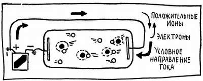 Внутри батареи за счет химических реакций электроны вновь перебрасываются с плюса на минус, чтобы оттуда вновь отправиться в свое путешествие по проводнику и, может быть, вновь добраться до плюса. Совершенно ясно, что если в проводнике есть свободные положительные заряды, то они будут двигаться в обратном направлении, а если заряды обоих «сортов», то в проводнике одновременно возникает два тока, противоположных по направлению. В дальнейшем для того, чтобы не вводить излишнюю путаницу, рассматривая различные электрические цепи, мы не будем вдаваться в подробности, не будем разбираться в том, каких зарядов больше, какие из них в основном создают ток, а всегда будем считать, что в проводнике есть только свободные положительные заряды, например положительные ионы, и что только они и создают ток. Поэтому мы всегда будем считать, что направление тока в проводнике одно — от плюса к минусу (рис. 4).