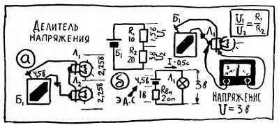 Иногда делитель напряжения возникает помимо нашего желания. Вы, наверно, обращали внимание на то, что в карманном фонаре нормально горит лампочка, рассчитанная на 3,5 в, в то время как э. д. с. батарейки равна 4,5 в. То, что лампочка не только не сгорает, но даже не перекаливается, объясняется очень просто — напряжение на ней никогда не превышает 3,5–3,8 в. Куда же девается остальная часть э. д. с.?