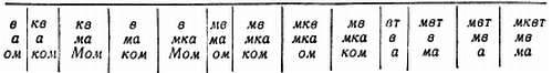 Ошибку, конечно, допустили мы сами, причем ошибку грубую и смешную. Ток нужно было выразить просто в амперах или результат в милливольтах. Для того чтобы вы в дальнейшем не смеялись нал результатами своих расчетов, предлагаем вам табличку, где в вертикальных столбиках указаны «комплекты» единиц, которыми нужно пользоваться при расчетах по формулах закона Ома, а также при вычислениях мощности.