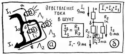 В данном случае действительно создается обходной путь для тока — в точке б ток разветвится — часть его пойдет по Л2, а часть — по Л3. При этом в каждой из двух параллельных ветвей ток окажется очень слабым, и обе лампочки практически светиться не будут. Но зато лампочка Л1 будет гореть намного ярче, чем до подключения шунта (Л3). Дело в том, что общее сопротивление двух параллельно включенных лампочек вдвое меньше, чем одной, — включить две лампочки параллельно это то же самое, что взять одну с более толстой нитью. Ну, а раз сопротивление какого-нибудь участка цепи уменьшилось (в нашем случае это участок бв), то на нем действует меньшая часть э. д. с. и поэтому возрастает напряжение, которое достается лампочке Л1.