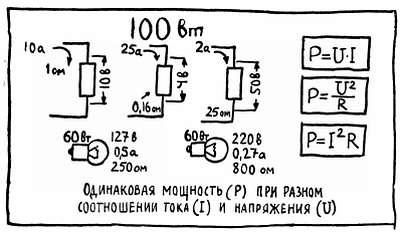 Очень важно еще раз подчеркнуть, что мощность в одинаковой степени зависит и от тока и от напряжения. Это значит, что одну и ту же мощность можно получить при большом токе и малом напряжении или, наоборот, большом напряжении и малом токе (рис. 10).