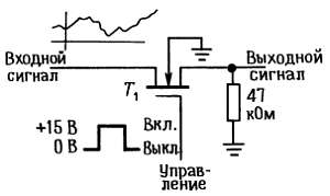 Т1 — n-канальный МОП-транзистор обогащенного типа, не проводящий ток при заземленном затворе или при отрицательном напряжении затвора. В этом состоянии сопротивление сток-исток (Rвыкл), как правило, больше 10000 МОм, и сигнал не проходит через ключ (хотя на высоких частотах будут некоторые наводки через емкость сток-исток; подробнее об этом см. дальше). Подача на затвор напряжения +15 В приводит канал сток-исток в проводящее состояние с типичным сопротивлением от 25 до 100 Ом (Rвкл) для ПТ, используемых в качестве аналоговых ключей. Схема не критична к значению уровня сигнала на затворе, поскольку он существенно более положителен, чем это необходимо для поддержания малого Rвкл, и поэтому его можно задавать от логических схем (можно использовать внешний полевой или биполярный транзистор для получения уровней, соответствующих полному диапазону питания) или даже ОУ: вполне годится ± 13 В с выхода схемы 741, так как напряжение пробоя затвора МОП-транзистора обычно равно 20 В или более. Обратное смещение затвора при отрицательных значениях выхода ОУ будет давать дополнительное преимущество-можно переключать сигналы любой полярности, как опишем позже. Заметим, что ключ на ПТ-двунаправленное устройство, т. е. он может пропускать сигнал в обе стороны. Это легко понять, так как механический выключатель тоже обладает этим свойством.