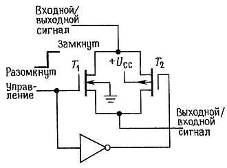 Треугольник на схеме — это цифровой инвертор, который мы вкратце опишем: он преобразует высокий уровень входного сигнала в низкий уровень выходного и наоборот. При высоком уровне управляющего сигнала Т1 пропускает сигналы с уровнями от земли до UСС без нескольких вольт (при более высоких уровнях сигнала Rвкл начинает драматическим образом расти). Аналогично Т2 при заземленном затворе пропускает сигнал с уровнями от UСС до значения на несколько вольт выше уровня земли. Таким образом, все сигналы в диапазоне от земли до UСС проходят через схему с малым сопротивлением (рис. 3.37).