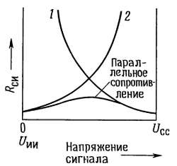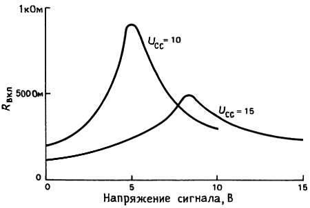 При уменьшении UСС сопротивление ПТ во включенном состоянии становится значительно выше (особенно вблизи точки UЗИ = UСС/2), так как для ПТ обогащенного типа UП составляет по крайней мере несколько вольт и для достижения малых значений Rвкл требуется напряжение затвор-исток не меньше чем 5-10 В. Кроме того, что параллельное сопротивление двух ПТ растет при уровне сигнала, среднем между напряжением питания и землей, этот пик (при 0,5UСС) будет увеличиваться по мере уменьшения UСС, и при достаточно низком UСС ключ для сигналов с уровнем около 0,5UСС будет представлять разомкнутую цепь.