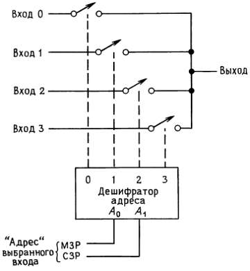 Мультиплексоры. Хорошим приложением ПТ-ключей являются мультиплексоры — схемы, которые позволяют выбрать один из нескольких входов по указанию управляющего цифрового сигнала. Аналоговый сигнал с этого выбранного входа будет прямо проходить на (единственный) выход. На рис. 3.38 показана функциональная схема такого устройства.
