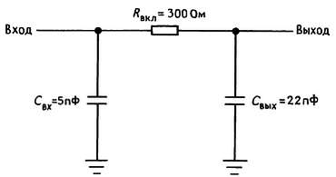 Быстродействие. ПТ-ключи имеют сопротивление во включенном состоянии Rвкл от 25 до 250 Ом. В комбинации с емкостью подложки и паразитными емкостями это сопротивление образует фильтр нижних частот, ограничивающий рабочие частоты значениями порядка 10 МГц и даже ниже (рис. 3.39).