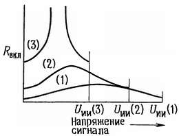 Сопротивление в открытом (включенном) состоянии. Ключи КМОП, работающие от относительно высокого напряжения питания (скажем, 15 В), будут иметь малые значения Rвкл во всем диапазоне значений сигнала, так как всегда тот или другой проводящий транзистор будет иметь прямое смещение затвора, равное по крайней мере половине напряжения питания. Но при меньшем напряжении питания сопротивление ключа Rвкл будет расти, и максимум его имеет место при уровне сигнала, среднем между напряжением питания и землей (или между двумя напряжениями питания при двуполярном питании) (рис. 3.40).