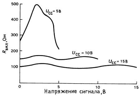 Рис. 3.41. Сопротивление включенного (замкнутого) канала аналогового КМОП-ключа типа 4016.