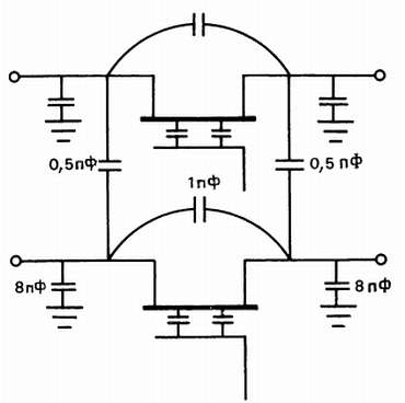 Емкость. ПТ-ключи обладают следующими емкостями: между входом и выходом (ССИ), между каналом и землей (СС, СИ), между затвором и каналом и между двумя ПТ в пределах одного кристалла (ССС, СИИ); см. рис. 3.44.
